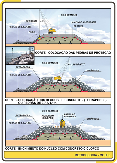 São feitos, também, serviços de escavação e dragagem para que se atinja a cota de fundo das estruturas. Em seguida serão colocados os tapetes de ancoragem que funcionarão como um embasamento para o núcleo, composto pelo mesmo material dos tubos de geotêxtil.